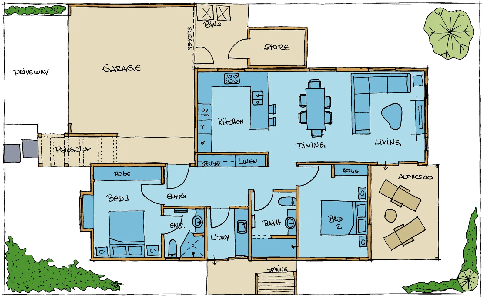 †All-inclusive Providence specifications such as stone bench tops, high-end appliances, insulation, acoustic treatment, solar & battery pack, inverter, air conditioning, Wi-Fi, and complete low maintenance and water friendly landscaping package.